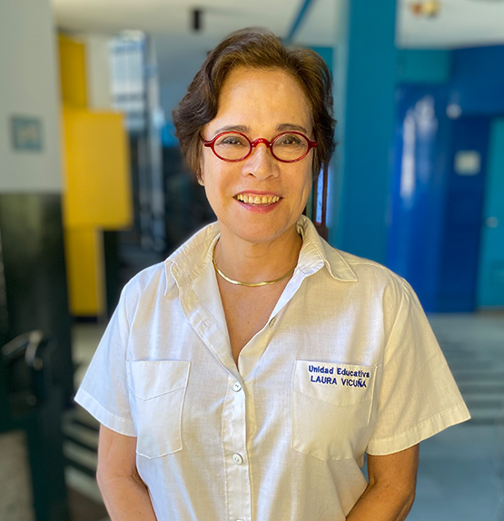 Ella es la profesora Mariela y tiene 5 años en la institución. Es la profesora de Educación Artística de 1er. año y a 2do. año y en 6to. grado da dibujo libre.